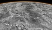Phlegra Montes jsou možnou základnou lokality. V popředí je současný ledovec, v pozadí jsou zamrzlé pláně Arcadia Planitia.