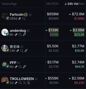 Parhaat Pumpfun-kolikot viimeisen 24 tunnin ajalta volyymin perusteella: $Fartcoin $Underdog $ Vaativa mauton $Pfp $Trolloween 🤖: