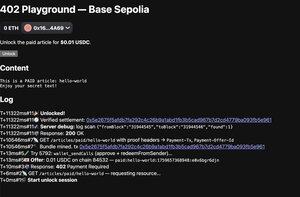Uusi vibekoodausprojekti. x402 Playground: Julkinen sivusto, jossa on maksullisia artikkeleita, jotka maksavat 0,01 USDC Base Sepoliassa. Maksu suoritetaan x402-tyylisellä kaksivaiheisella kädenpuristuksella.