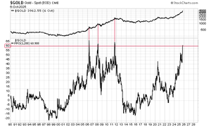 Varians emas vs. rata-rata eksponensial 200 minggu melampaui 60% pada penutupan kemarin, menunjukkan jeda atau koreksi jika perilaku dekade milenial menjadi panduan.
