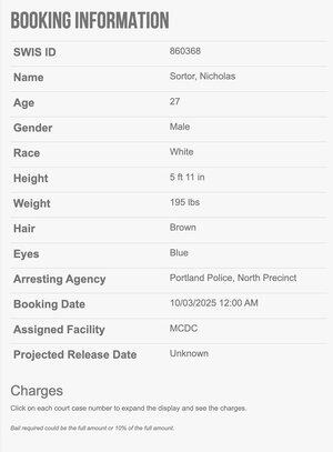 .@nicksortor è stato arrestato e portato nella prigione locale di Portland, Ore., dopo essere stato arrestato fuori dalla struttura ICE dalla @PortlandPolice. Non si sa ancora su cosa sia stato arrestato. Le sue accuse pendenti non sono ancora elencate.