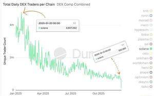 🚨 OPPDATERING: Antallet aktive tradere på $SOL har falt fra 4,8 millioner til 680 000 siden starten av 2025, noe som markerer en omtrent 7 ganger nedgang i aktivitet.