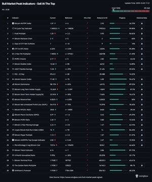 🚨 WNIOSKI: Dane Coinglass pokazują, że żaden z 30 wskaźników nie sygnalizuje szczytu rynku, co sugeruje, że cykl wciąż ma miejsce do rozwoju przed ostatnią fazą rynku byka.