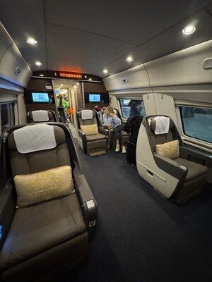 İş sınıfı kabinde, kabine ayrılmış bir hostes ile düz yatabilen 5 büyük koltuk vardır ve size kahve, su, portakal suyu gibi içecekler servis eder. Sanırım daha uzun bir yolculuksa, muhtemelen yemek de servis edilir