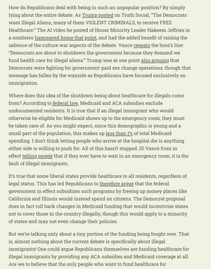 Абсолютно в захваті від того, що республіканці можуть влаштувати дебати щодо субсидій на охорону здоров'я, де їх кількість знизилася 80 на 20, і перетворити їх на боротьбу за імміграцію.