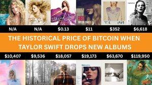 泰勒·斯威夫特新专辑发布时比特币的历史价格 🟠 泰勒·斯威夫特 (2006): N/A 🟠 Fearless (2008): N/A 🟠 Speak Now (2010): $0.13 🟠 Red (2012): $11 🟠 1989 (2014): $352 🟠 Reputation (2017): $6,618 🟠 Lover (2019): $10,407 🟠 Folklore (2020): $9,536 🟠 Evermore (2020): $18,057 🟠 Midnights (2022): $19,173 🟠 Tortured Poets Department (2024): $63,670 🟠 Life of a Showgirl (2025): $119,950