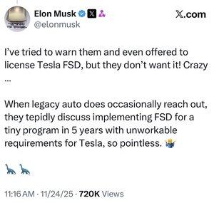 任何不认真对待特斯拉FSD的传统汽车公司将在几年内变得过时。没有人会想要一辆不能自主驾驶的汽车。这就像今天骑马……有些人只是因为好玩而去做。但已经不再是移动的必要方式。