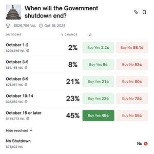 突發消息:根據 Polymarket,政府關閉的情況有 45% 的機會成為歷史上最長的。