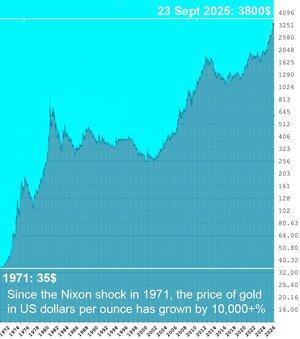 自1971年尼克森震盪以來,黃金的價格以美元計算已增長了100倍;標準普爾500指數增長了70倍;道瓊斯指數增長了50倍;能源成本增長了20倍。黃金是衡量真實通脹的可靠指標:1美分(1971年)= 1美元(2025年)。然而,根據官方通脹率,自1971年以來,美元的價值僅損失了90%,而不是99%。政治!黃金自身的通脹率由於新開採的黃金約為每年2%。自羅馬時代以來,其購買力基本保持不變,而所有法定貨幣的價值自那時以來已降至幾乎為零。 讓我們來看一下全局。所有開採過的黃金都可以放進一個邊長約22米的立方體中,價值幾乎相當於全球年GDP的四分之一,或約世界總價值的五十分之一,包括所有不動產、基礎設施、股權、退休金等。這相當於一個邊長小於90米的黃金立方體。你無法從太空中看到那個小立方體。地球的核心至少還藏有十億倍以上無法觸及的黃金。我甚至不想談論其他的太陽系。因此,所有人類擁有的財富似乎都微不足道。願這個想法能帶給你內心的平靜。🙂